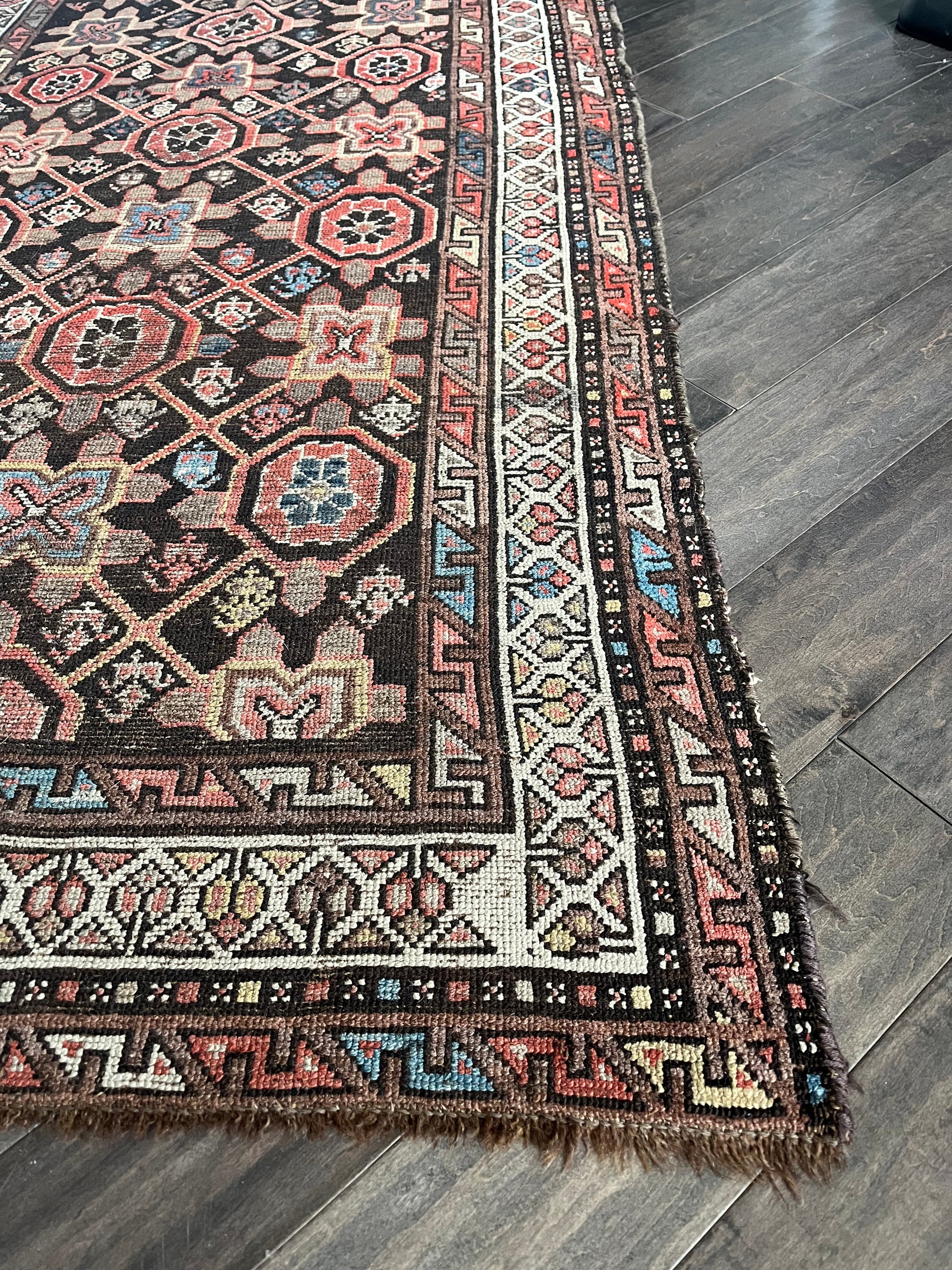 This antique rug is a rare gem! I picture her in an office or den to give a moody, but colorful vibe to the area. You could even use this one as a wall hanging for some added texture to your walls. This one is definitely hard to part with, but can't wait to see who is lucky enough to snag her!