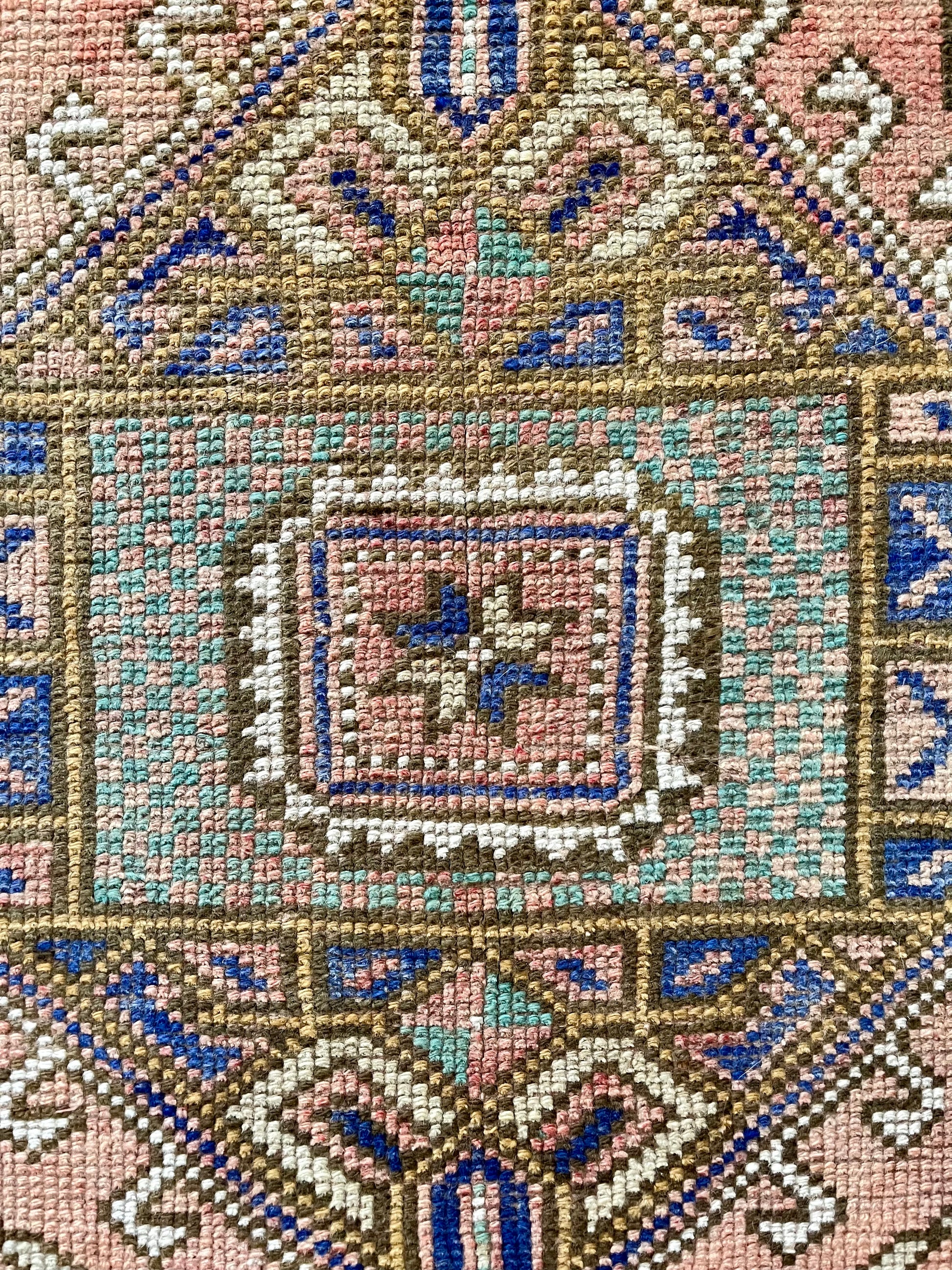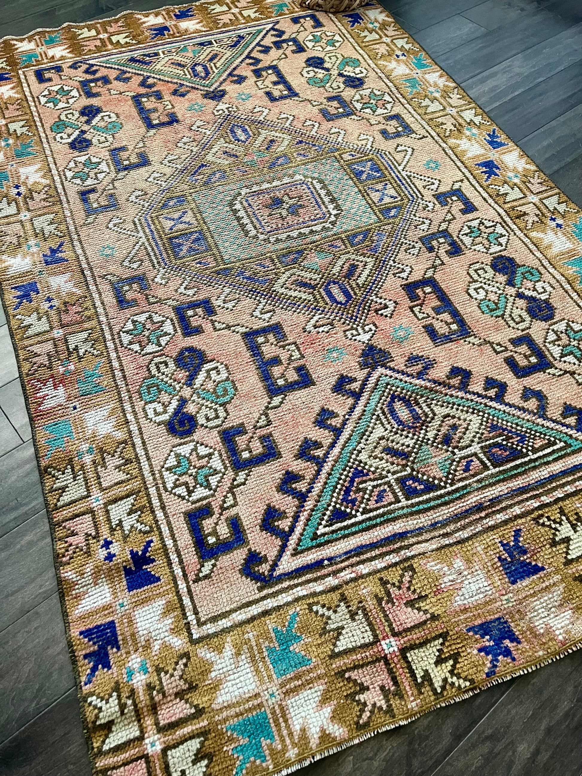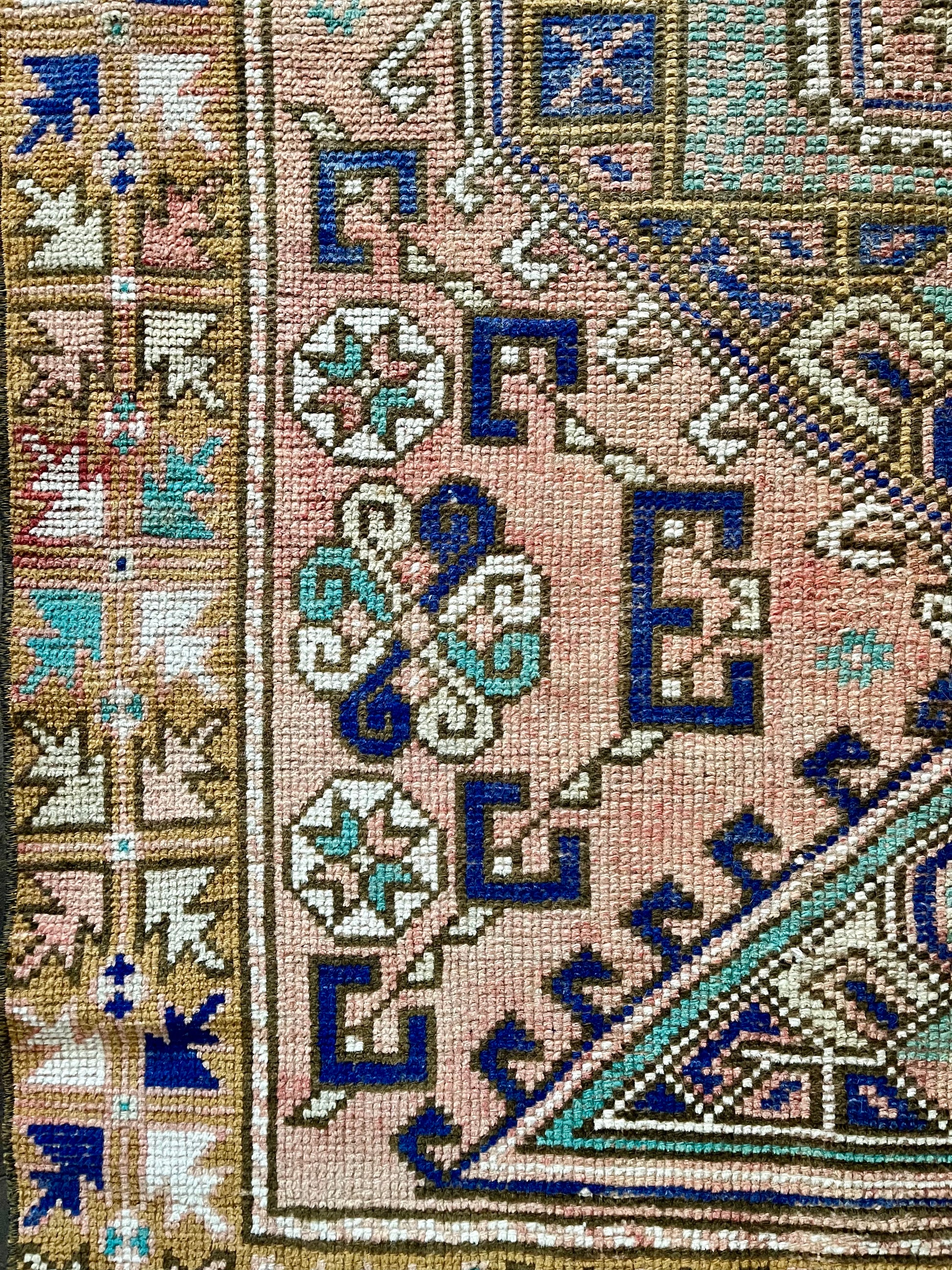 This vintage rug is so difficult to not keep for myself. She's beautiful and versatile - you can place her just about anywhere and she'll shine. I love the light abrash (variations in one color) throughout the field with colors including dusty pink, gold/yellow, cobalt blue, turquoise and white. Can't wait to see where this bohemian beauty ends up!