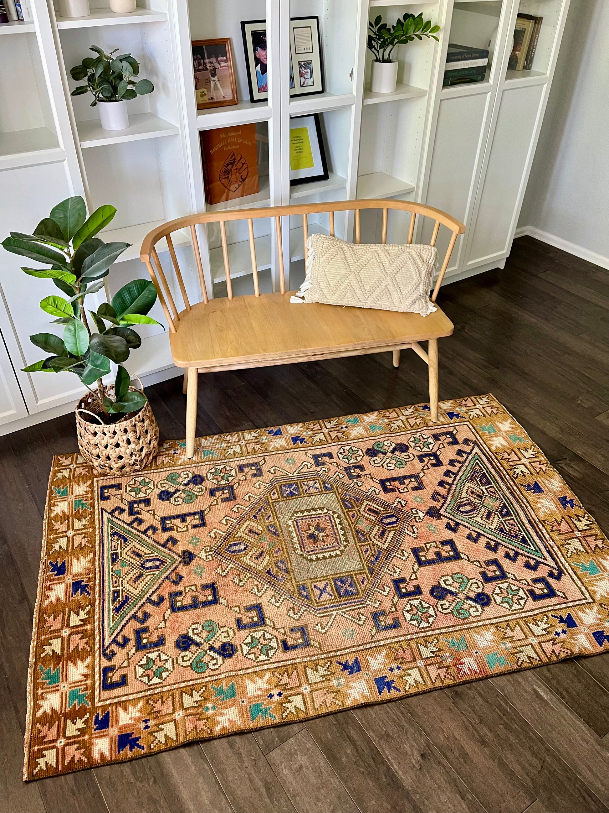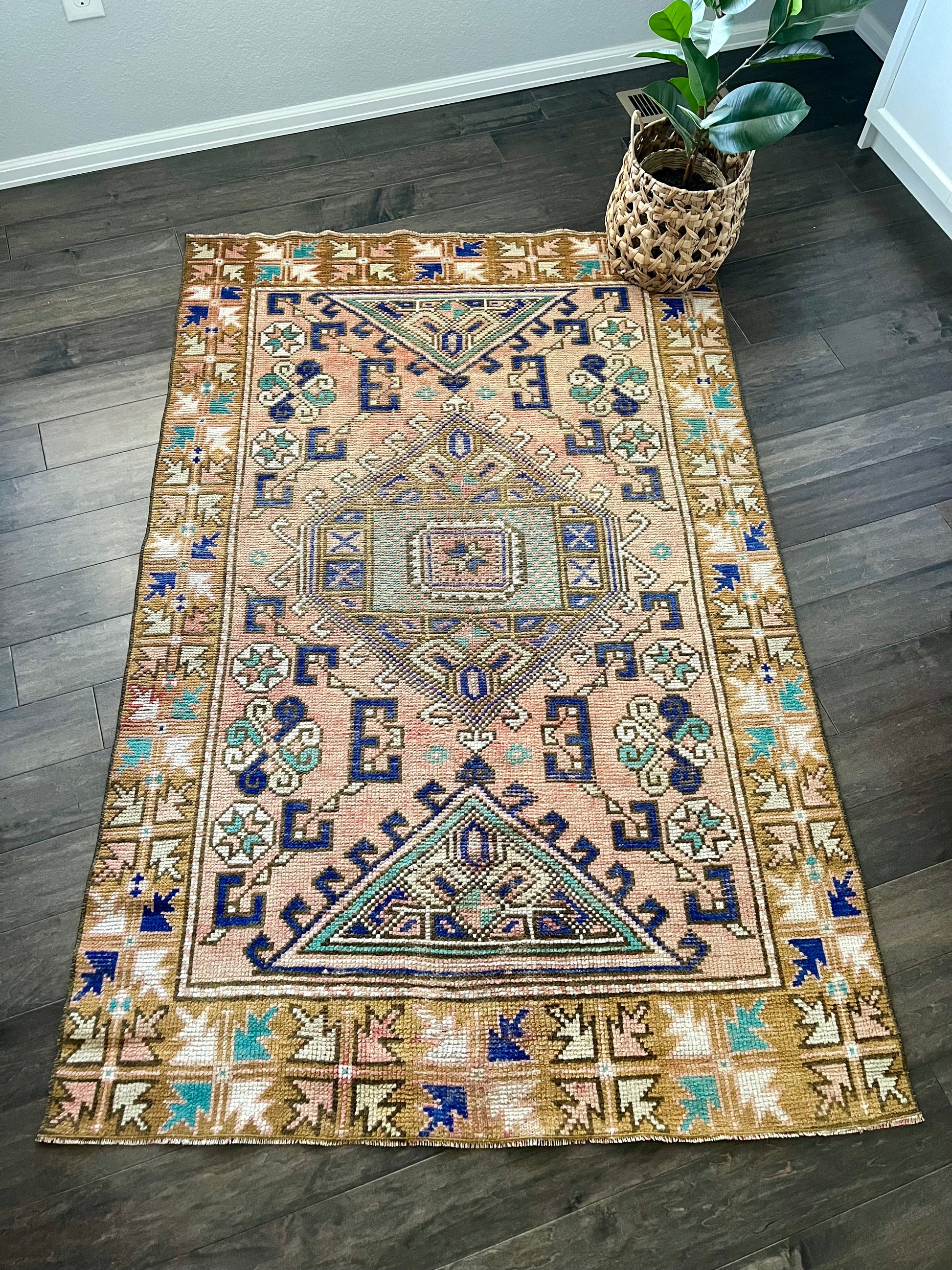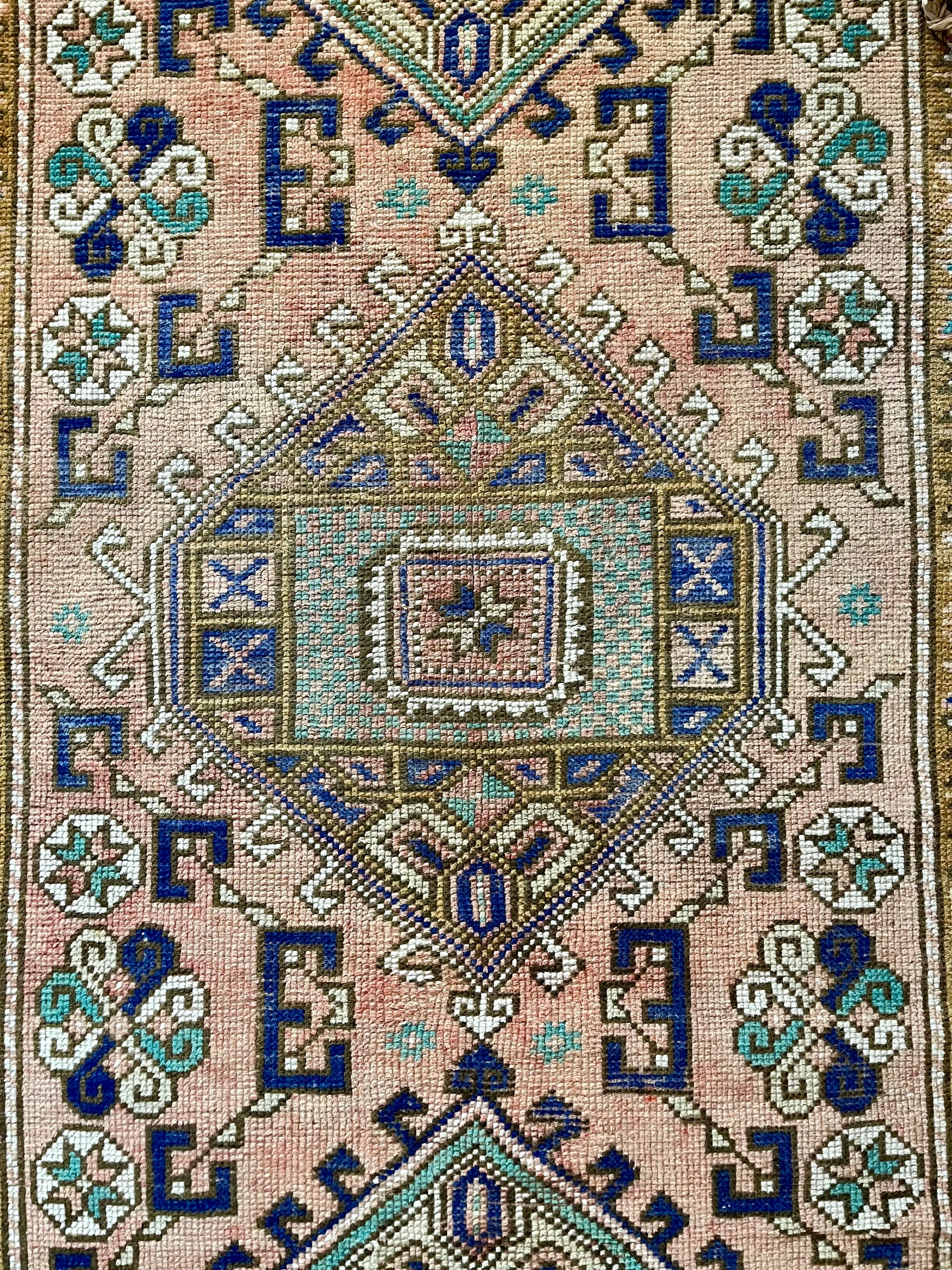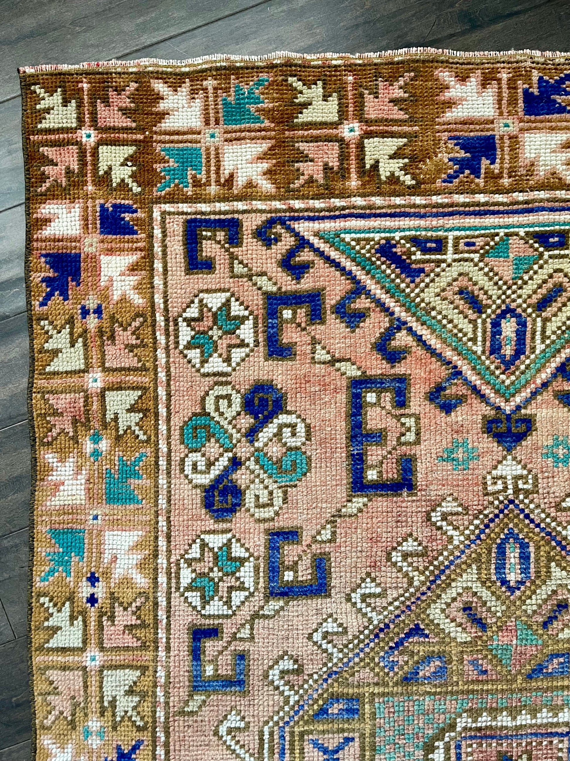 This vintage rug is so difficult to not keep for myself. She's beautiful and versatile - you can place her just about anywhere and she'll shine. I love the light abrash (variations in one color) throughout the field with colors including dusty pink, gold/yellow, cobalt blue, turquoise and white. Can't wait to see where this bohemian beauty ends up!