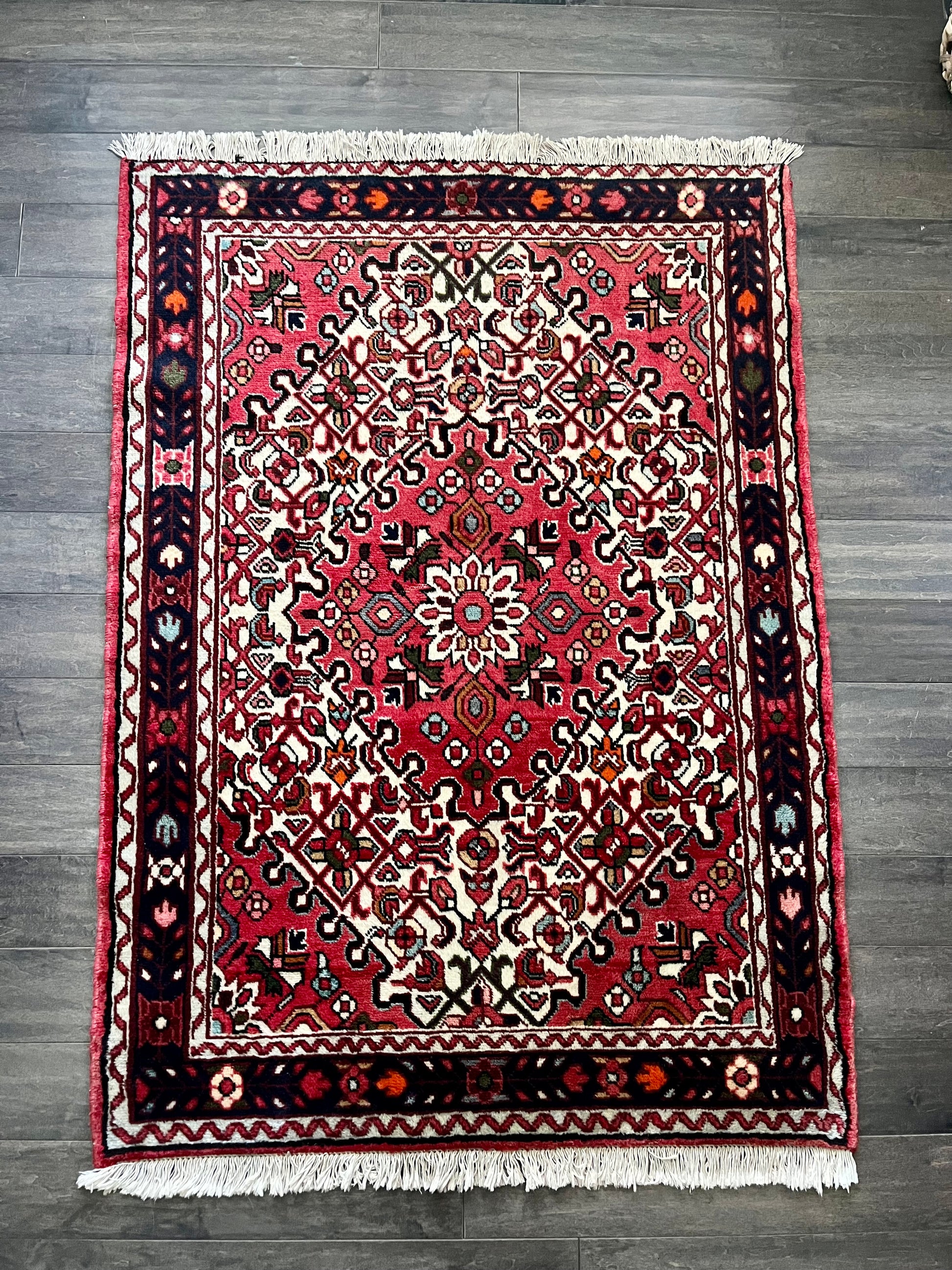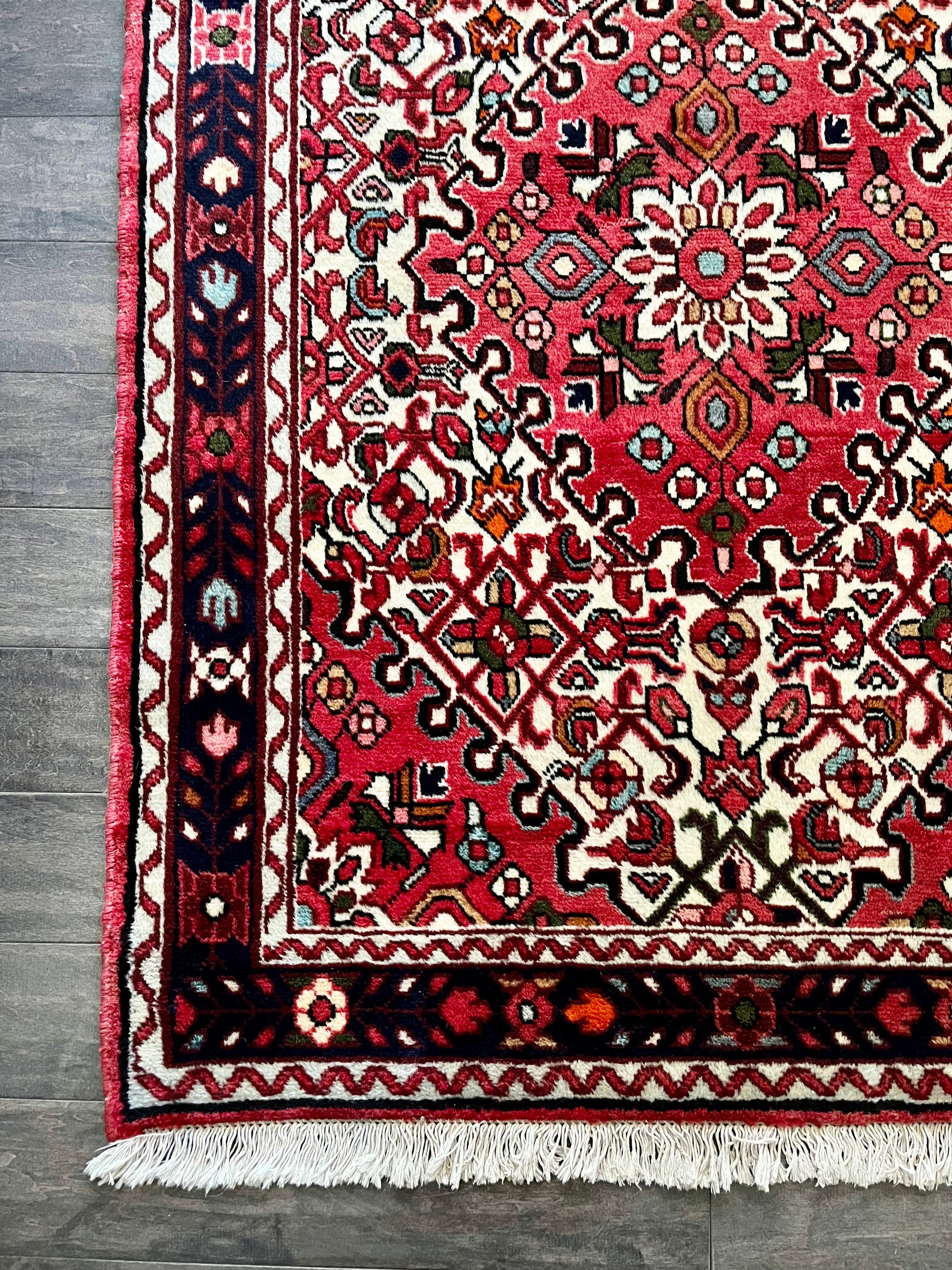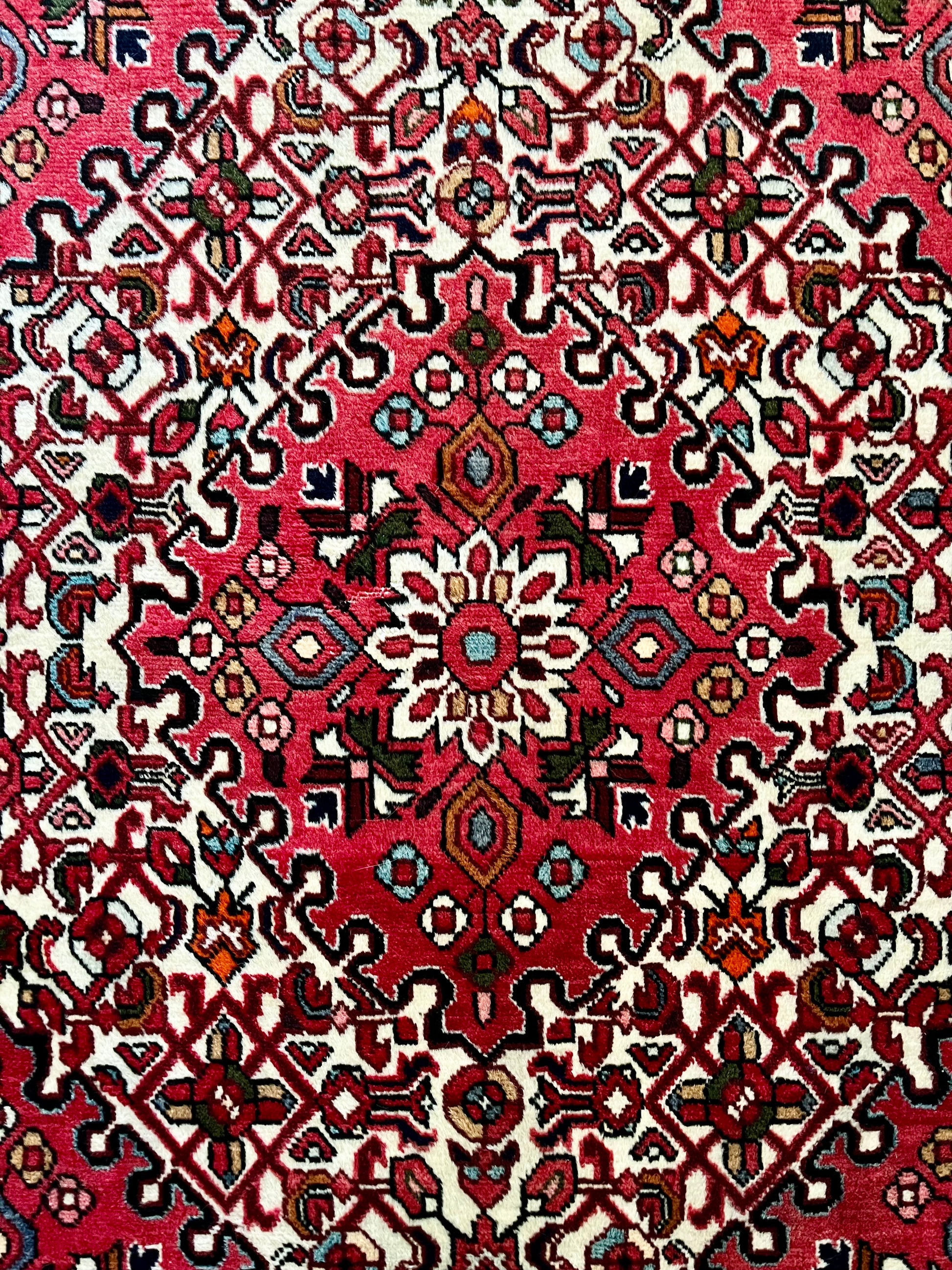 This vintage rug has incredible rich colors and a plush underfoot feel. She has it all - reds, light blues, dark greens and taupes. Put this one somewhere where you need some cushion and stunning color - she's gorgeous!