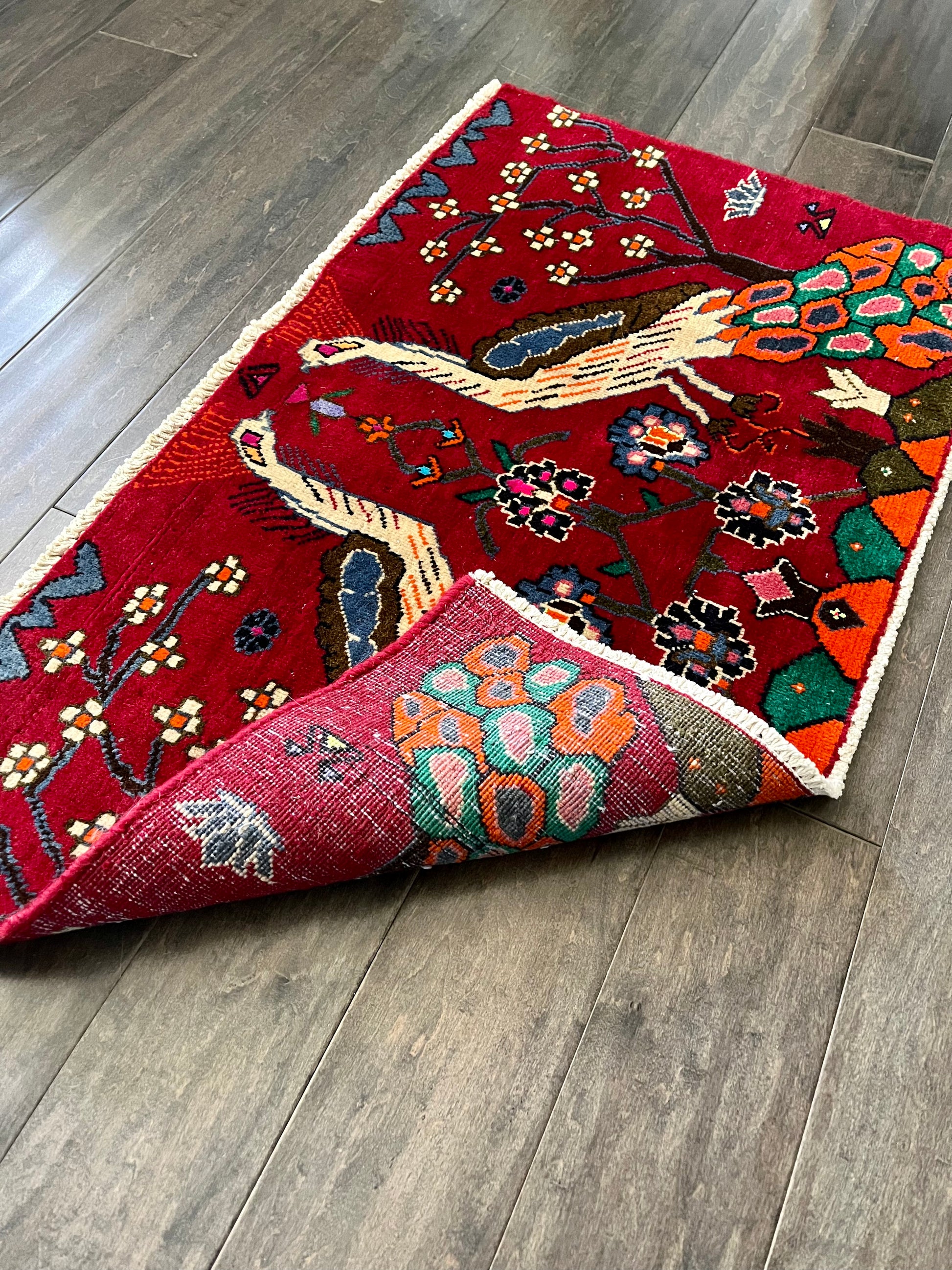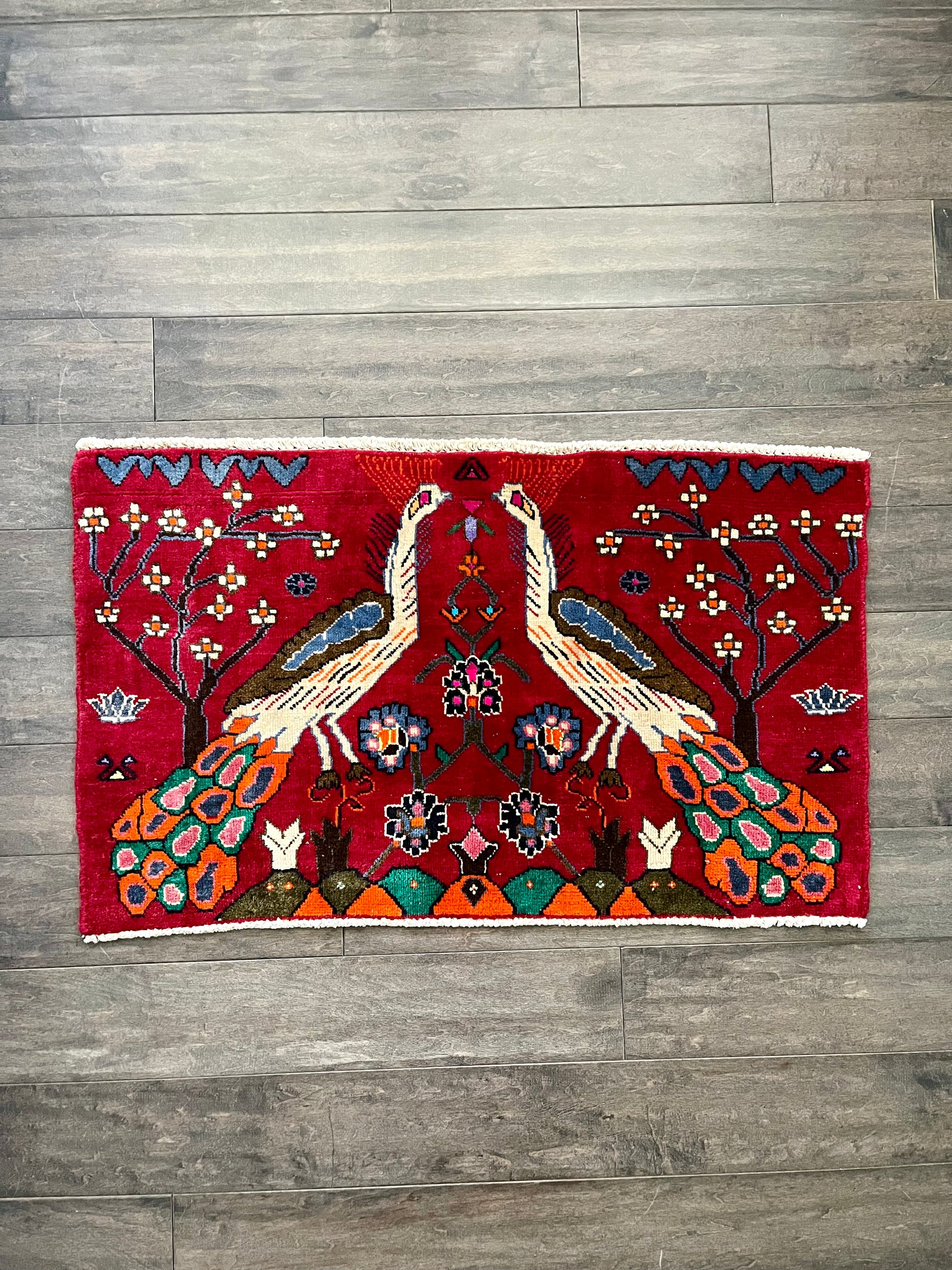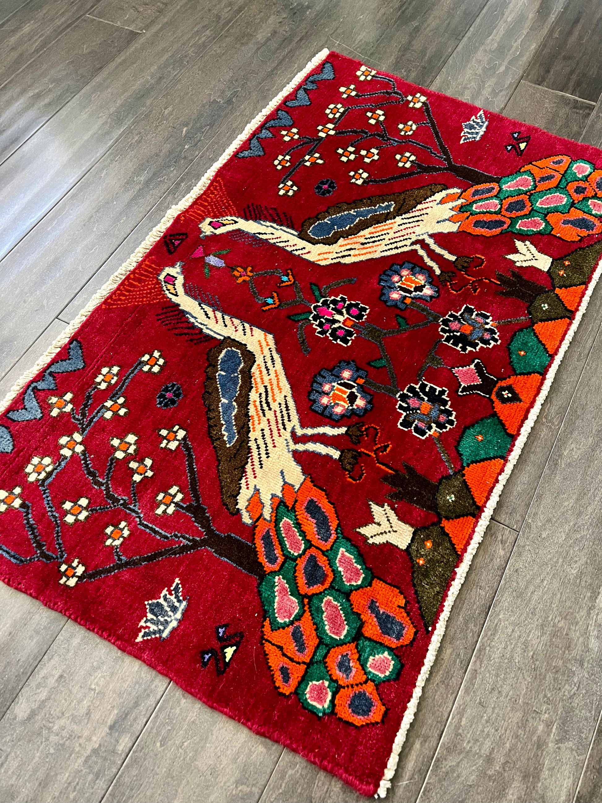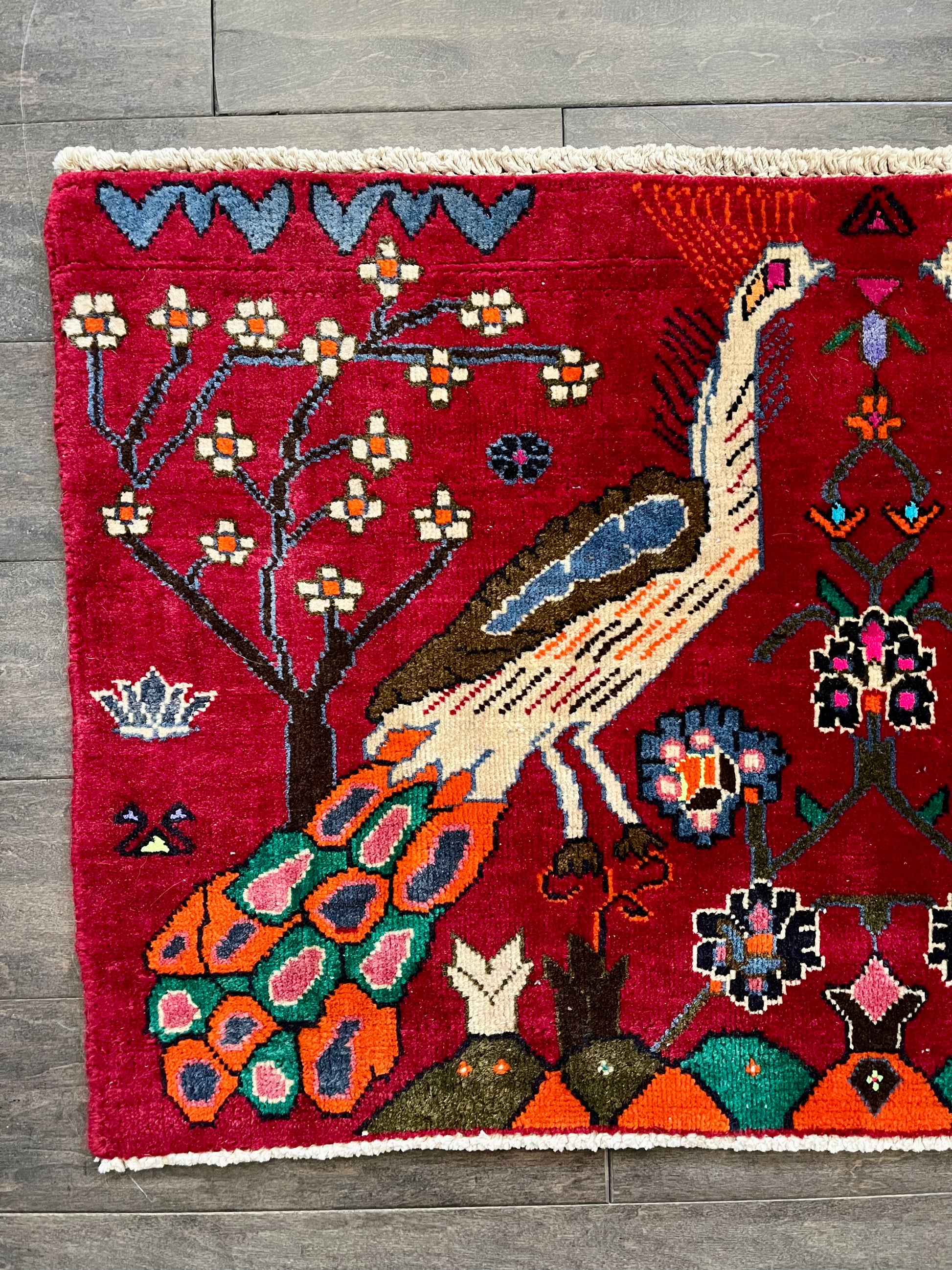 This vintage rug is like a peacock party showing off their fabulous feathers in a vibrant red garden. With pops of blue, orange, green and hot pink, it's as if these birds are celebrating with confetti made of flowers and geometric shapes. Bold and playful, this rug is ready to strut its stuff and add some lively personality to your home!
