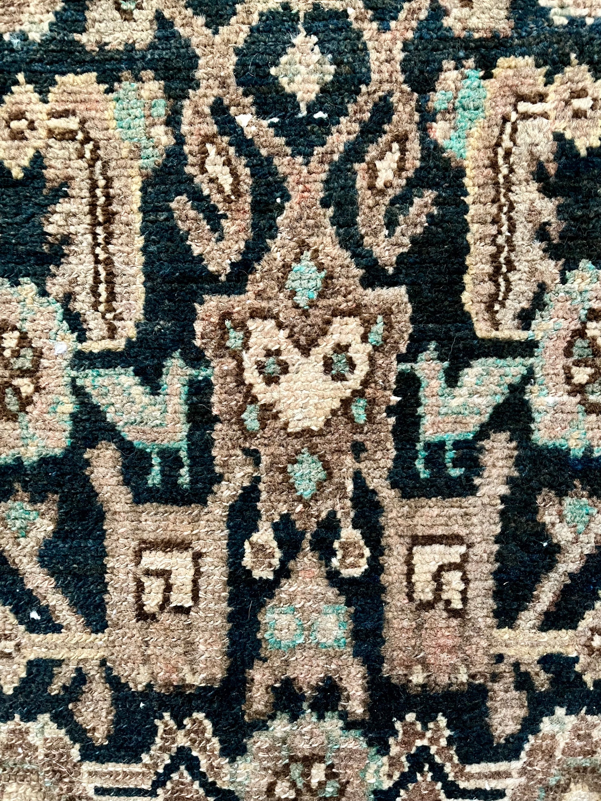 This dark, moody vintage beauty is perfection. She has a beautiful red and terracotta abrash field along with navy blues, taupes and browns. She's the perfect size for pretty much any spot - entryway, kitchen, reading nook, office, etc.