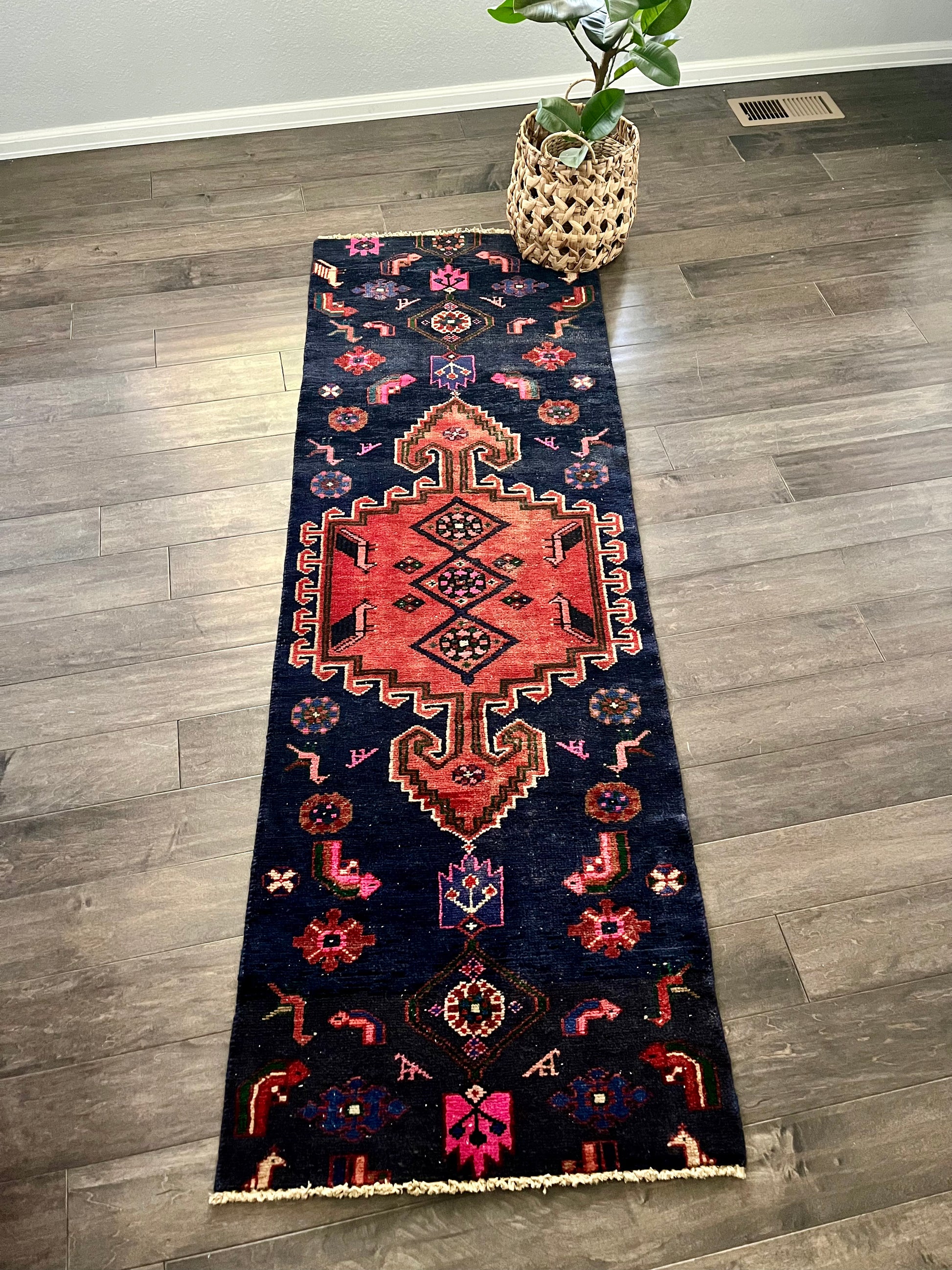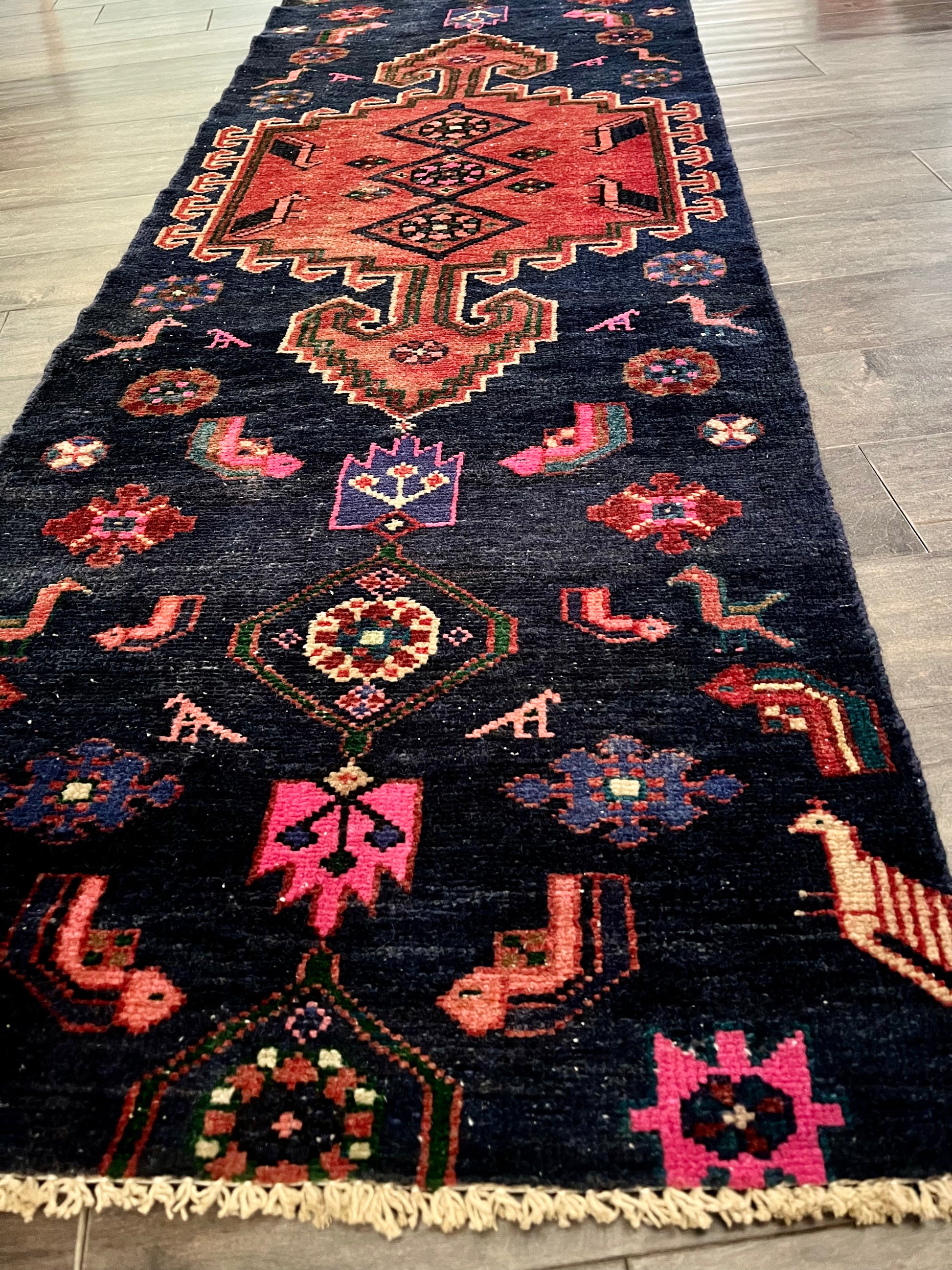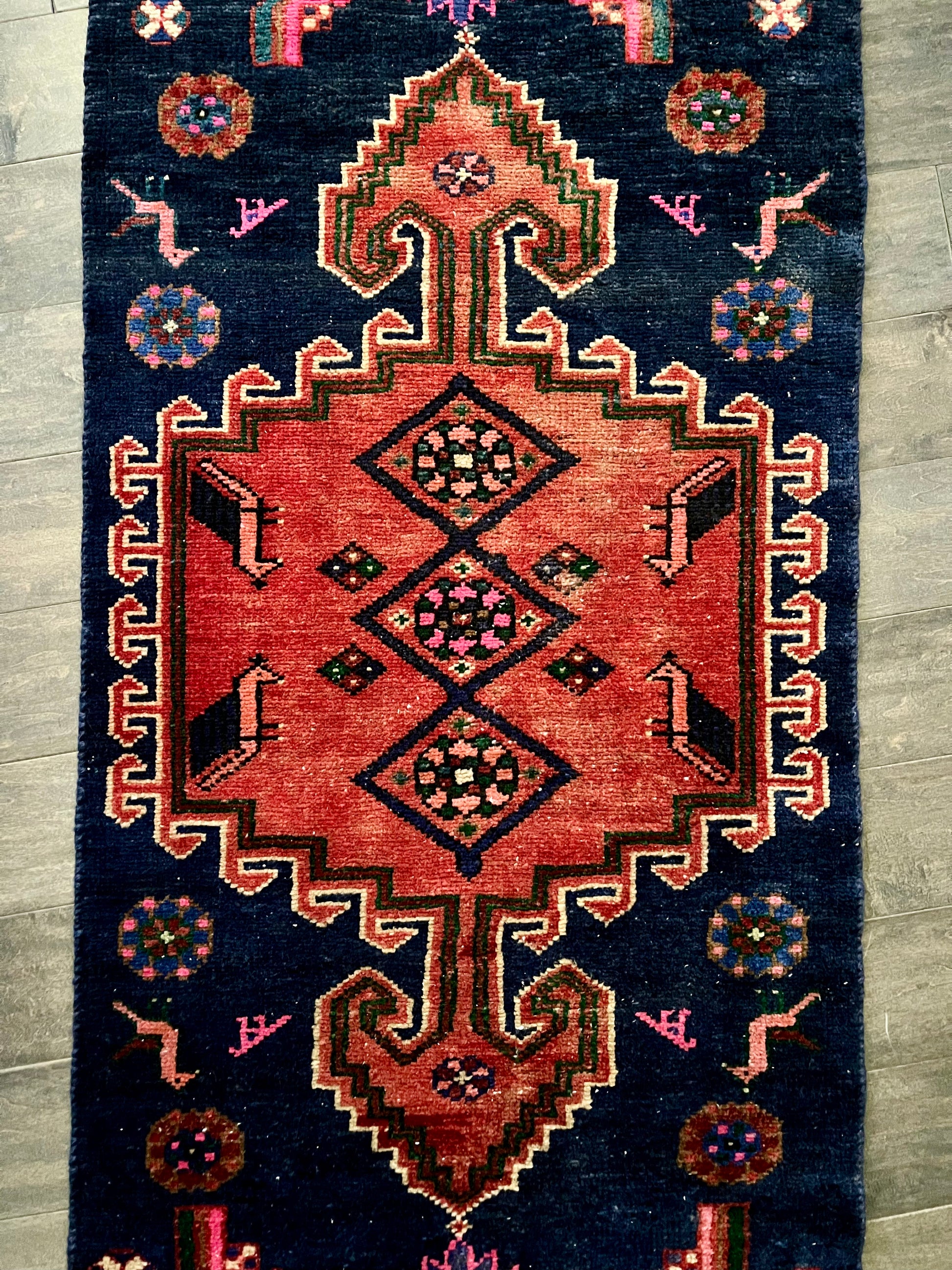 This vibrant vintage runner brings an explosion of color and bold shapes to your floor, with deep navy blue and rich red & pink tones creating a striking contrast. The playful geometric, floral and bird motifs dance across the rug like a treasure map. Perfect for adding a pop of personality to any room, it's a conversation starter that's ready to steal the show!