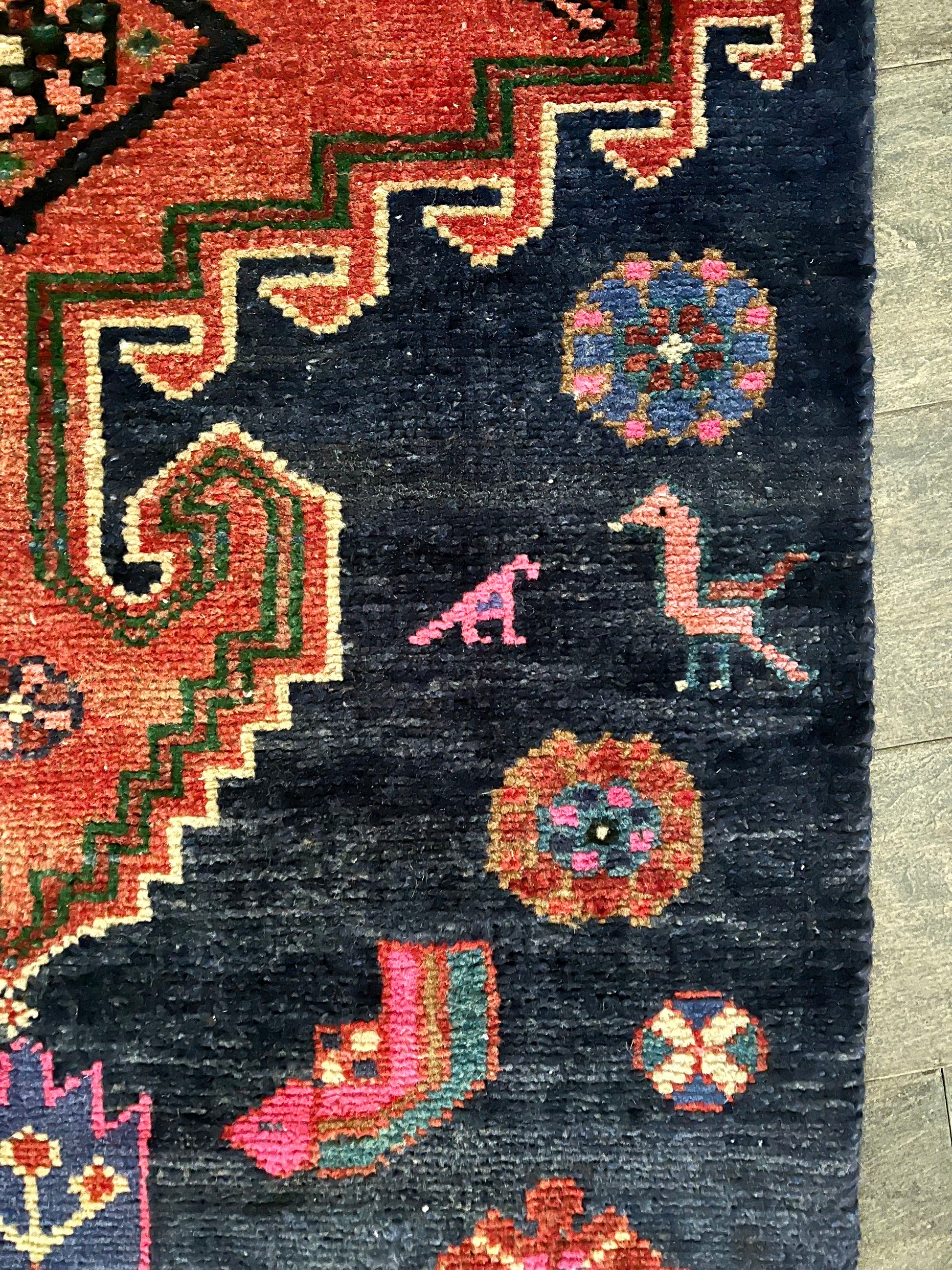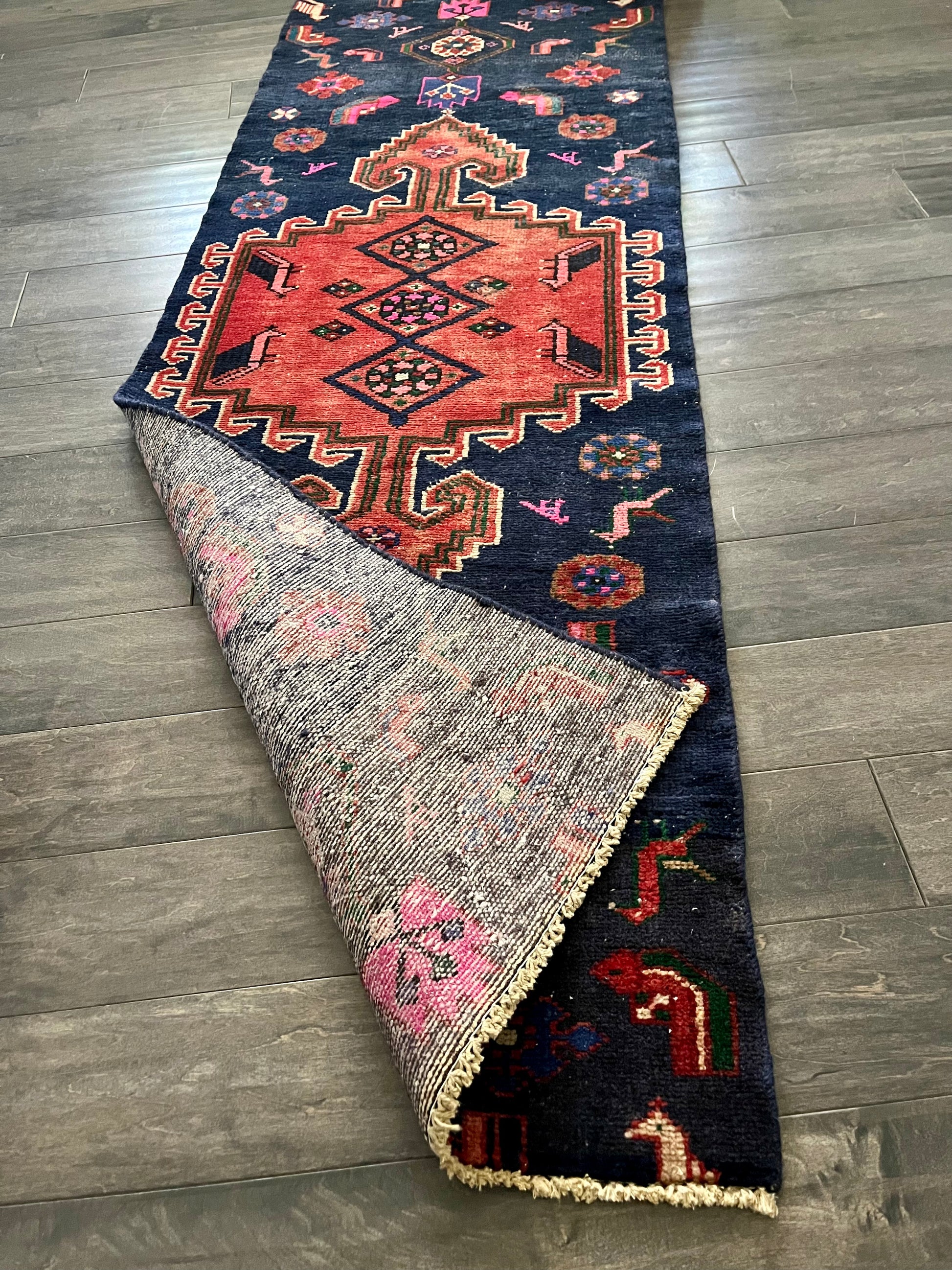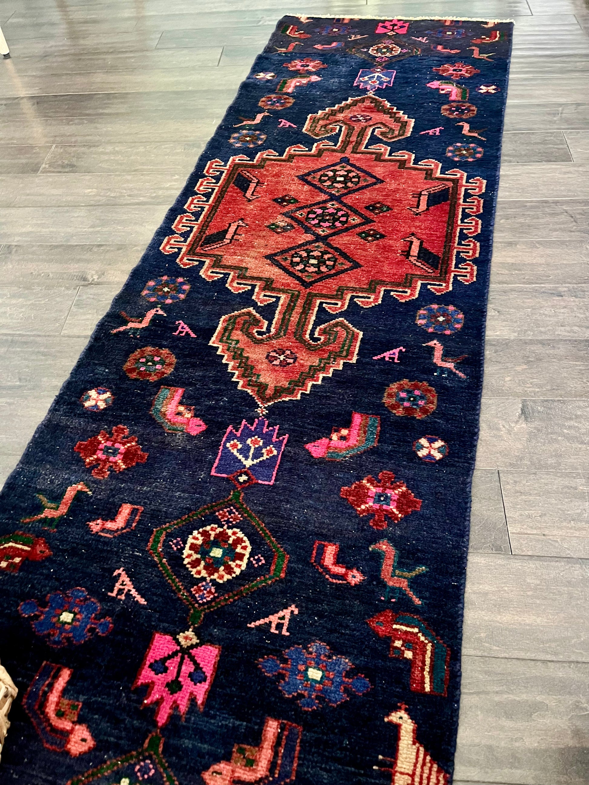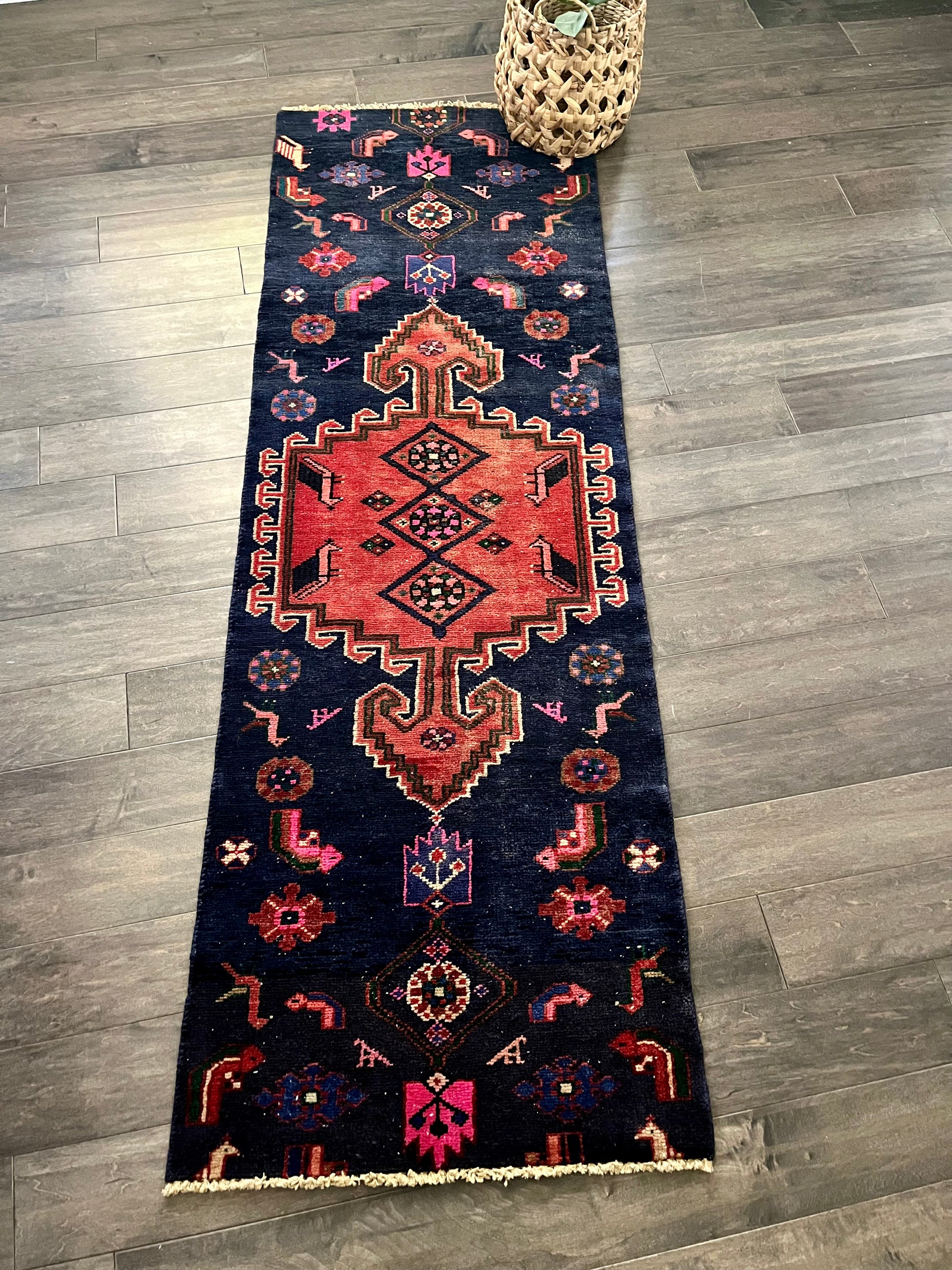 This vibrant vintage runner brings an explosion of color and bold shapes to your floor, with deep navy blue and rich red & pink tones creating a striking contrast. The playful geometric, floral and bird motifs dance across the rug like a treasure map. Perfect for adding a pop of personality to any room, it's a conversation starter that's ready to steal the show!