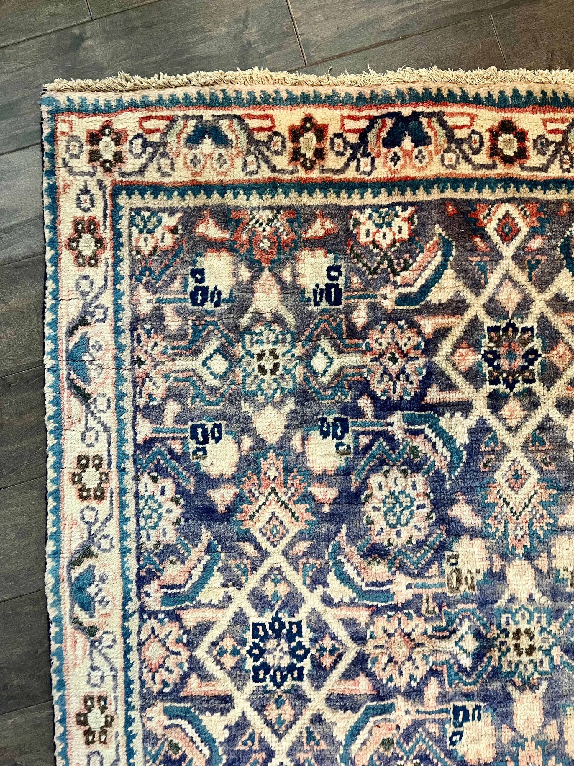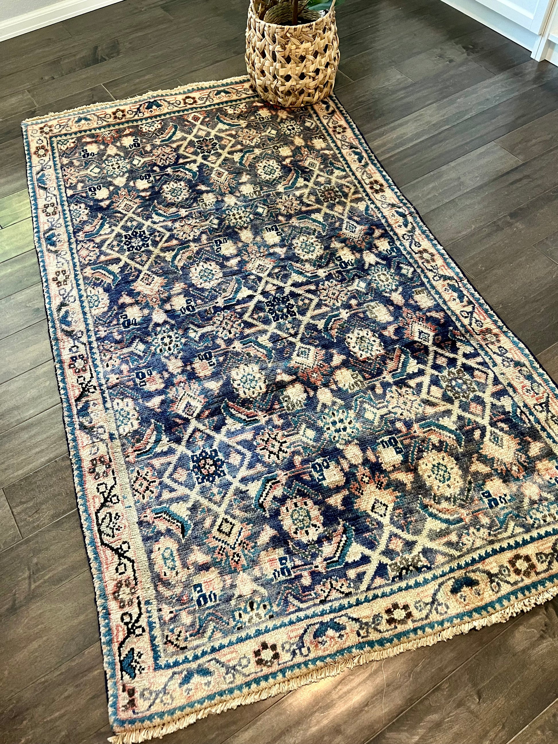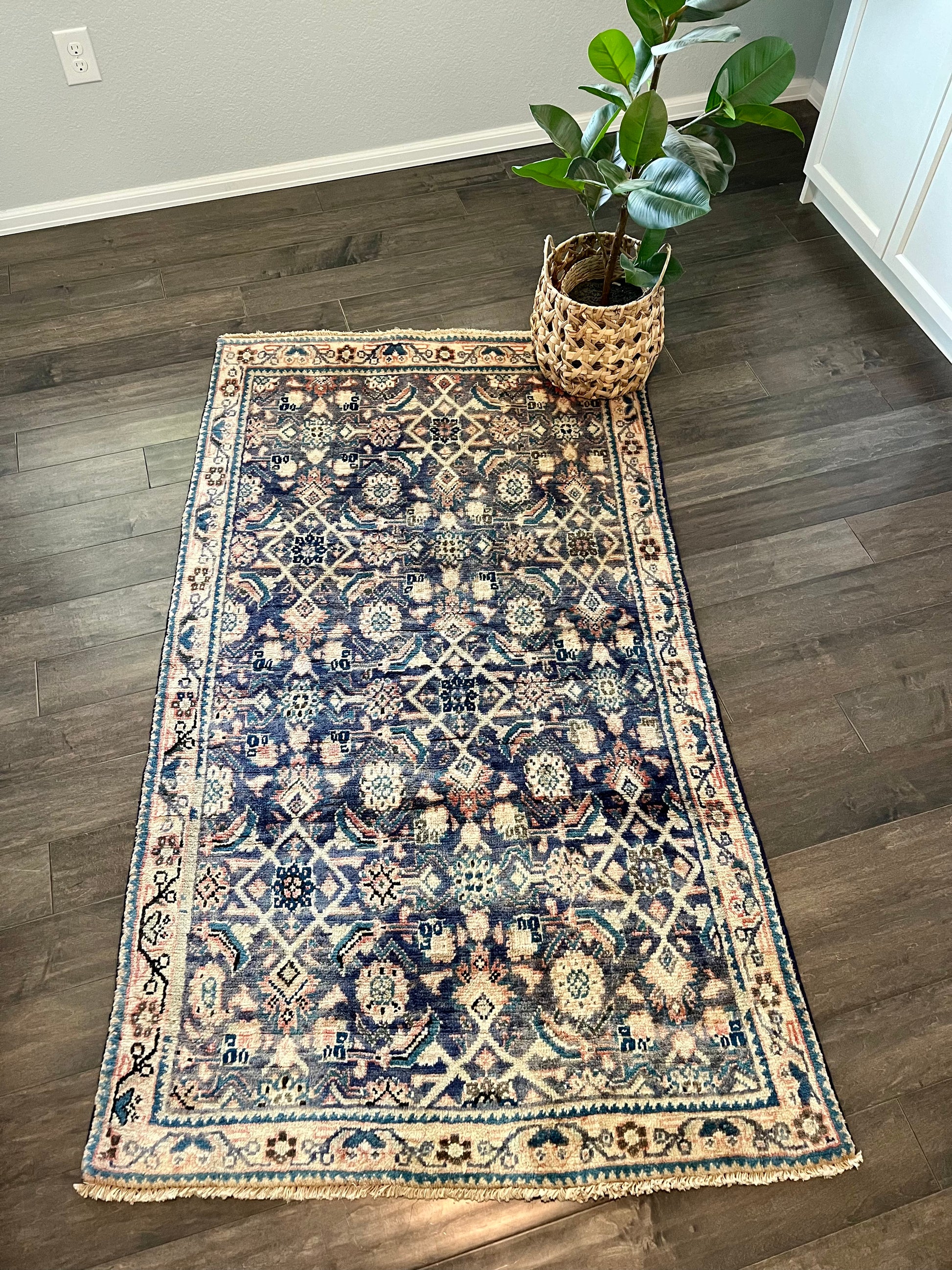 This vintage rug is a delightful tapestry of blues, dusty pinks & blushes, and soft creams, reminiscent of a starlit night in an ancient city. Its intricate geometric patterns and floral motifs invite stories of old-world charm into your modern home. Perfect for cozy corners, it adds warmth and a splash of history to any space.