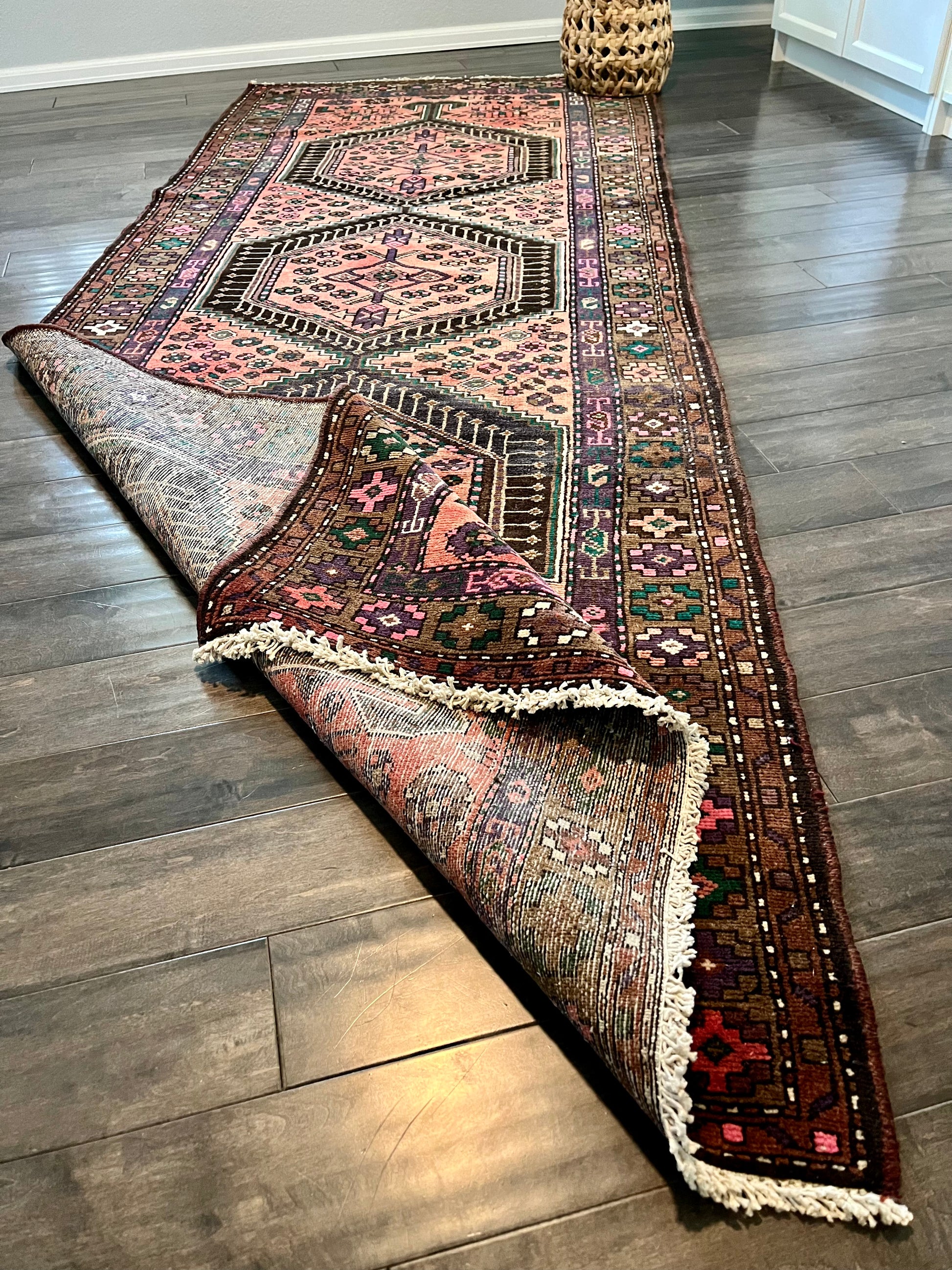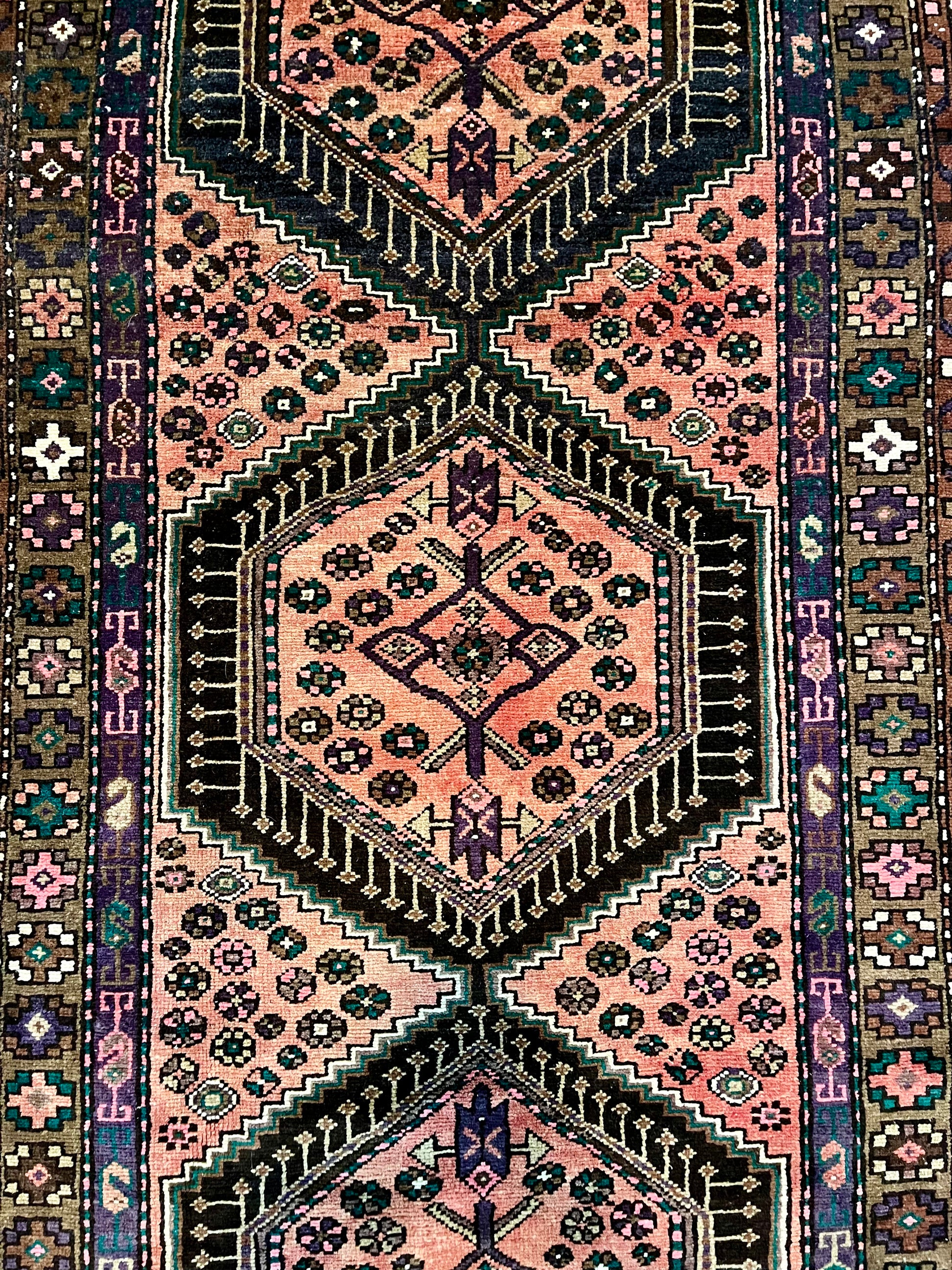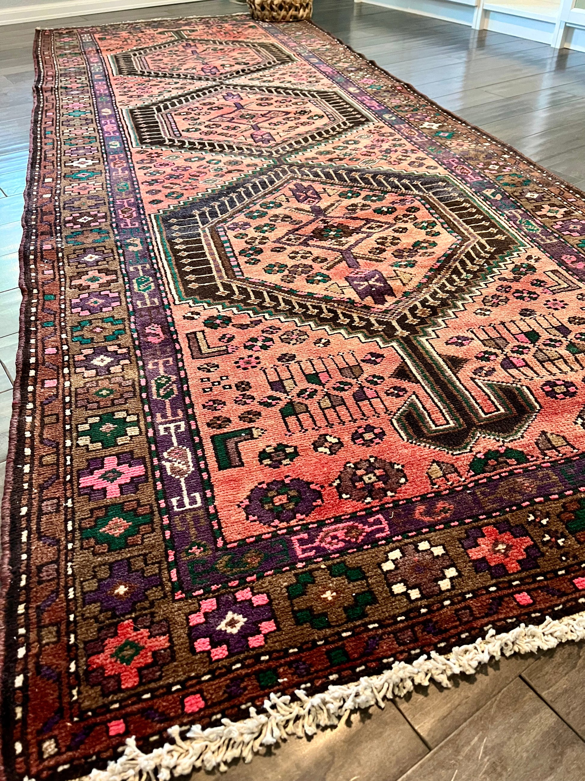 This stunning vintage rug brings warmth and charm with its gorgeous pink abrash field, intricate hexagonal medallions, and playful floral accents. The detailed border, rich in earthy greens and purples, frames the piece like a work of art, making it a perfect statement for any hallway or living space. I can't wait to see where this beauty lands!