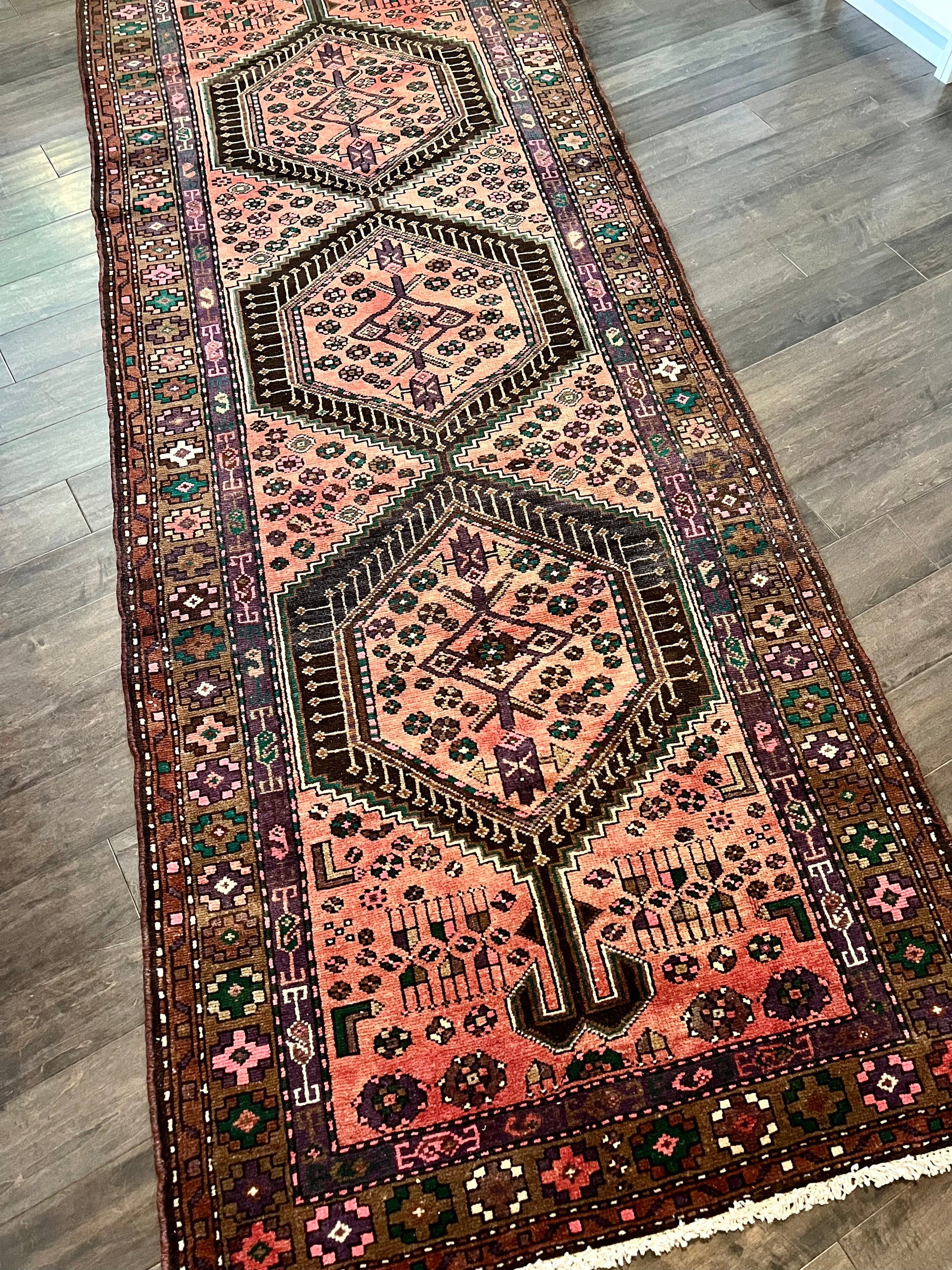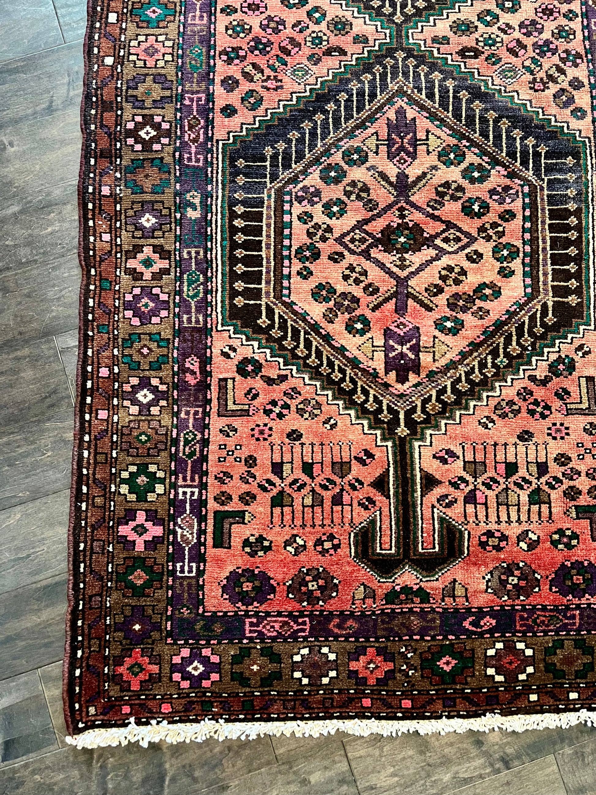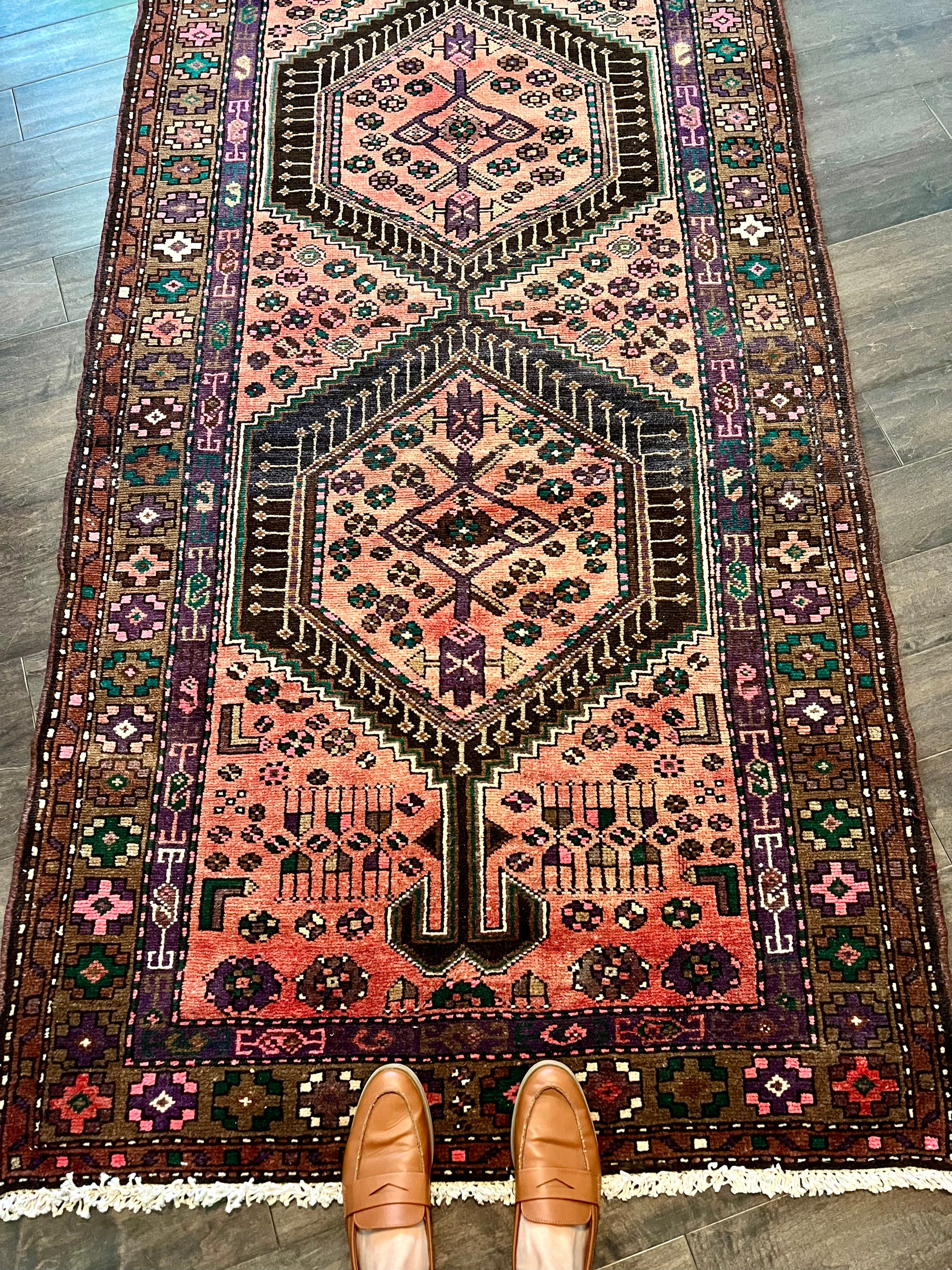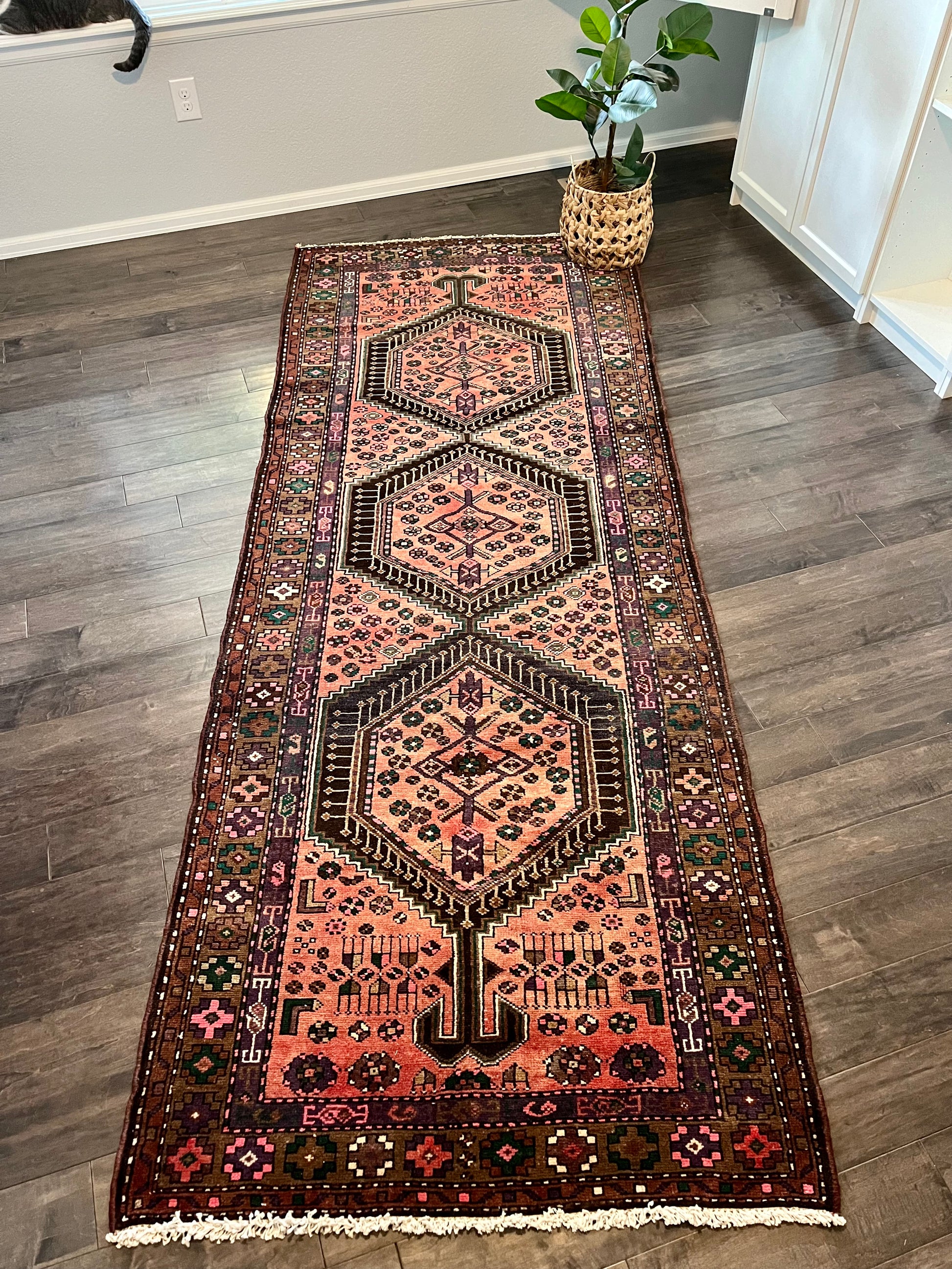 This stunning vintage rug brings warmth and charm with its gorgeous pink abrash field, intricate hexagonal medallions, and playful floral accents. The detailed border, rich in earthy greens and purples, frames the piece like a work of art, making it a perfect statement for any hallway or living space. I can't wait to see where this beauty lands!